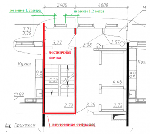 Другими словами: расстояние должно быть не менее 1,2 м между проемами лестничной клетки (лестнично-лифтового узла), между оконным проемом в наружной стене, дверным проемом во внутренней стене лестничной клетки и проемами в наружной стене здания (помещений, смежных лестничной клетке, лестнично-лифтовому узлу?