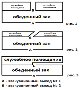 Что подразумевается под понятием прямого эвакуационного прохода к эвакуационному выходу? Ниже показаны варианты выходов из залов, связанные прямыми проходами (рис.1, рис.2, рис.3) какой вариант из приведенных не нарушает требований пожарной безопасности, а какой нарушает?