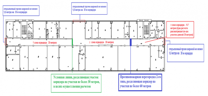 - предусмотрено естественное проветривание в соответствии с требованиями СП 7.13130.2013 , п.8.5 (т.е. верхняя кромка расположена не ниже 2,5 м от уровня пола, суммарная ширина оконных проемов не менее 3,9 м (1,6 м на каждые 30 м длины коридора)),