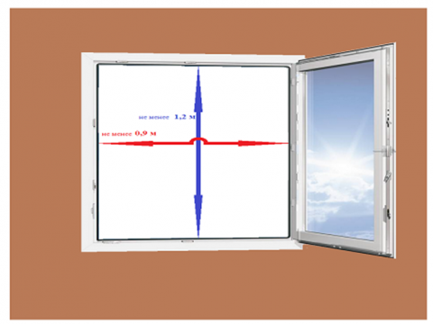 7.4.2 . В каждом отсеке (секции) подвального или цокольного этажа, выделенном противопожарными преградами, следует предусматривать не менее двух окон размерами не менее 0,9 x 1,2 м с приямками. Площадь светового проема указанных окон необходимо принимать по расчету, но не менее 0,2% площади пола этих помещений. Размеры приямка должны позволять осуществлять подачу огнетушащего вещества из пеногенератора и удаление дыма с помощью дымососа (расстояние от стены здания до границы приямка должно быть не менее 0,7 м).