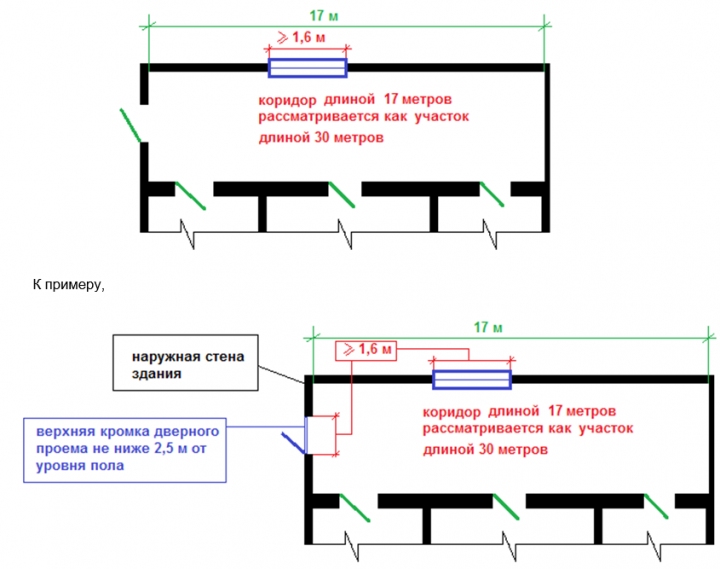 Поясняю. Если коридор 30 м окно не менее 1,6 м, Если коридор 60 м окно не менее 3,2 м - это понятно.