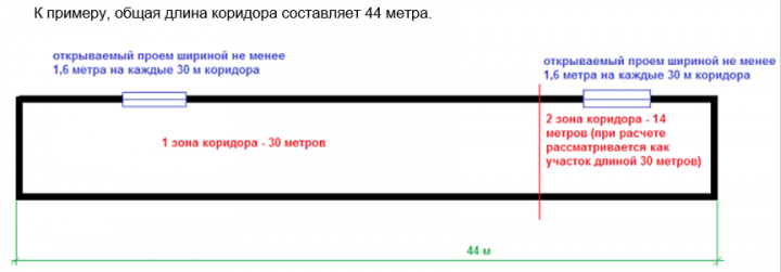 Для проветривания коридора требуется окно шириной не менее 1,6 м на каждые 30 м коридора.