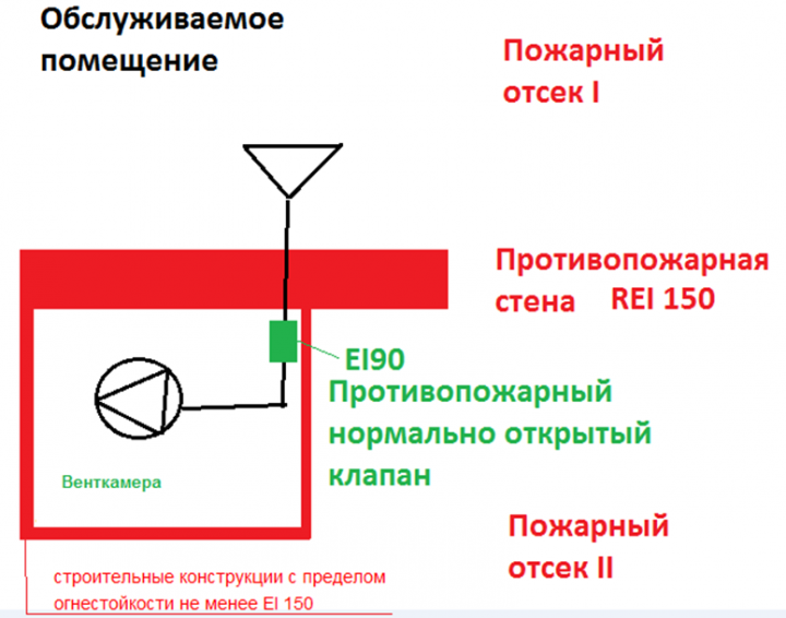 Вопрос: имеется обслуживаемое помещение и коридор. Коридор и обслуживаемое помещение разделены противопожарной преградой, т.е. обслуживаемое помещение к коридор находятся в разных пожарных отсеках. Возможно ли размещение вентиляционного оборудования с расходом воздуха 5 тыс. мі/ч и менее в подшивном потолке коридора другого пожарного отсека при условии установки противопожарного нормально открытого клапана в месте пересечения воздуховодом стены, разделяющим коридор и обслуживаемое помещение (например, со значением EI 90 - п.6.22 СП 7.13130) .