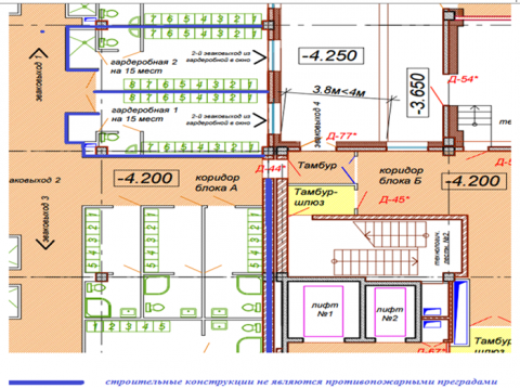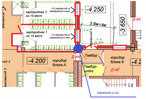 Т.е. возможность размещения 2-го эваковыхода из гардеробной 1 и эваковыхода 4 из блока Б под вопросом.