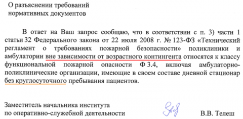 В соответствии с частью 1 статьи 32 Федерального закона от 22 июля 2008 г. № 123-ФЗ «Технический регламент о требованиях пожарной безопасности», здание дневного стационара (без круглосуточного пребывания пациентов) относится к классу функциональной пожарной опасности Ф3.4.