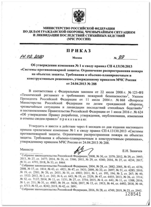 Приказом МЧС России от 14 февраля 2020 № 89, утверждены Изменения № 1 к своду правил СП 4.13130.2013 «Системы противопожарной защиты. Ограничение распространения пожара на объектах защиты. Требования к объемно-планировочным и конструктивным решениям». Данным приказом утверждаются и вносятся в действие через 6 месяцев со дня издания вносимые изменения.