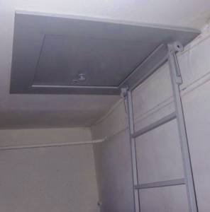 На чердаках зданий и сооружений, за исключением зданий класса Ф1.4, следует предусматривать выходы на кровлю, оборудованные стационарными лестницами, через двери, люки или окна размером не менее 0,6x0,8 метра (пункт 7.5 СП 4.13130.2013).