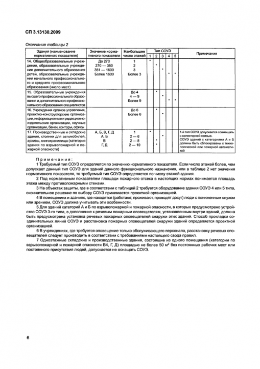 Здания (сооружения) должны оснащаться СОУЭ соответствующего типа в соответствии с таблицей 2 СП 3.13130.2009 «Системы противопожарной защиты. Система оповещения и управления эвакуацией людей при пожаре. Требования пожарной безопасности».