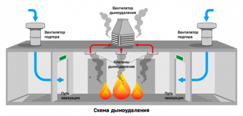 Согласно пункту 7.2 СП 7.13130.2013 удаление продуктов горения при пожаре системами вытяжной противодымной вентиляции следует предусматривать: