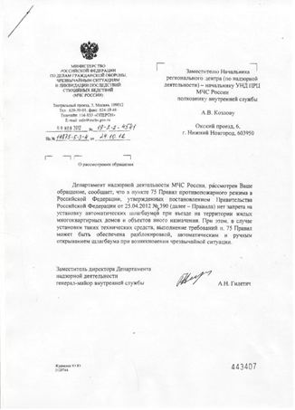 В соответствии с действующим законодательством и разъяснением Департамента надзорной деятельности и профилактической работы МЧС России (письмо № 19-2-2-4541 от 09.11.2012), при въезде на территории объектов установка автоматических шлагбаумов не запрещается, при условии, если будет обеспечена разблокировка автоматическим и ручным открыванием шлагбаума при возникновении чрезвычайной ситуации.