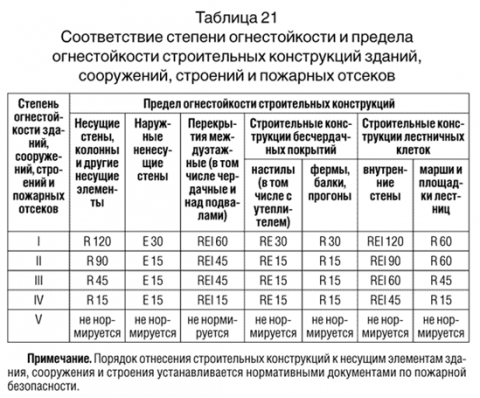 Требуемые пределы огнестойкости строительных конструкций, выбираемые в зависимости от степени огнестойкости зданий и сооружений, приведены в таблице 21 приложения к настоящему Федеральному закону (часть 2 статьи 58 ФЗ № 123-ФЗ).