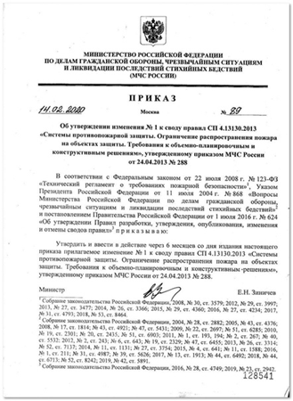 Приказом МЧС России от 14 февраля 2020 № 89, утверждено Изменение № 1 к своду правил СП 4.13130.2013 «Системы противопожарной защиты. Ограничение распространения пожара на объектах защиты. Требования к объемно-планировочным и конструктивным решениям».