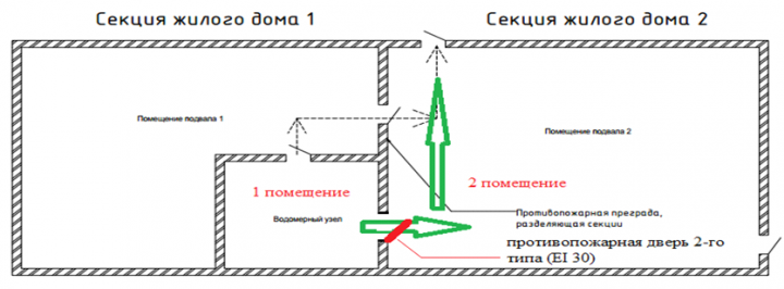 И второй, вытекающий отсюда вопрос, допустима ли следующая схема эвакуации из технических помещений, расположенных в подвале: например, водомерный узел расположен в секции 1 и имеет выход непосредственно в помещение подвала (схема во вложении), эвакуационный выход из подвала расположен в секции 2, на пути эвакуации от помещения водомерного узла до выхода находятся два участка подвала, разделенные противопожарными преградами, делящими подвал на секции (т.е. фактически два помещения). Противоречит ли такая схема п.3 ст.89 "Технического регламента о требованиях пожарной безопасности"?