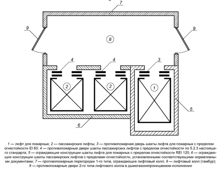 Согласно НПБ 250-97 п.5.1.7 при расположении лифта для пожарных в шахте с другими лифтами двери шахт всех лифтов должны быть с пределом огнестойкости 1,0 час. На прилагаемом плане этажа расположение лифтов смежное с монолитными бетонными стенками 200 мм. Распространяется ли требование п.5.1.7 на данное расположение лифтов?