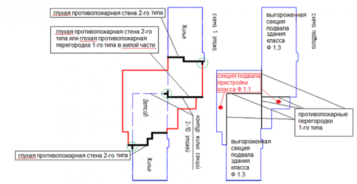 Как правильно поделить подвал на отсеки: по секциям в соответствии с 2-10 этажами, тогда куда отнести одноэтажные части или рассматривать здание не секционным и делить на отсеки по 500 м2?