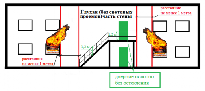 Согласно СП 1.13130 п.п.4.4.2 "Лестницы 3-го типа следует выполнять из негорючих материалов и размещать у глухих (без световых проемов) частей стен класса пожарной опасности не ниже К1 с пределом огнестойкости не ниже REI(EI)30. Эти лестницы должны иметь площадки на уровне эвакуационных выходов, ограждения высотой не менее 1,2 м и располагаться на расстоянии не менее 1 м от плоскости оконных проемов."