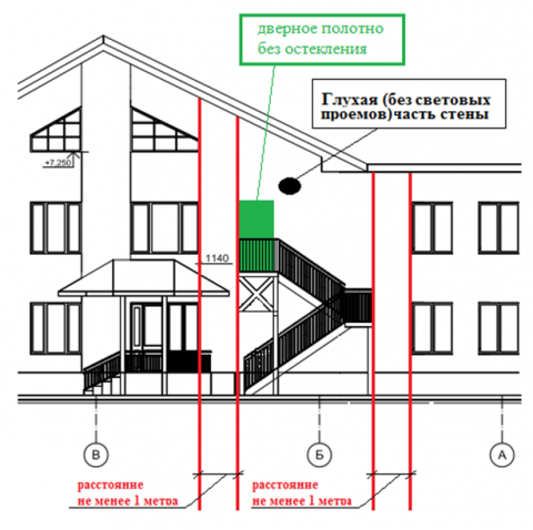 Есть проект детского сада, который разрабатывался в 2012 году и прошел экспертизу, сейчас его "привязывают" для строительства нового сада, так вот пожарник не пропускает расположение лестниц в осях Б-В. Но ведь расстояние от плоскости окна 1 м у нас выдержено. Прошу вашей помощи, помогите разобраться.