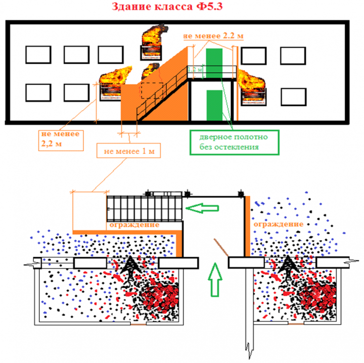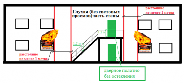 Каковы должны быть размеры данного сплошного ограждения из материалов группы НГ (на высоту ограждения, т.е. 1,2 метра от уровня площадок и ступеней лестничной клетки или на высоту оконного проёма, или на всю высоту лестничной клетки)?