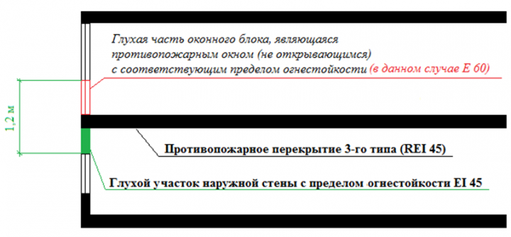 Допускается ли такое решение при повышении предела огнестойкости верхнего окна до EI 15 (требуемый предел огнестойкости всей стены)?