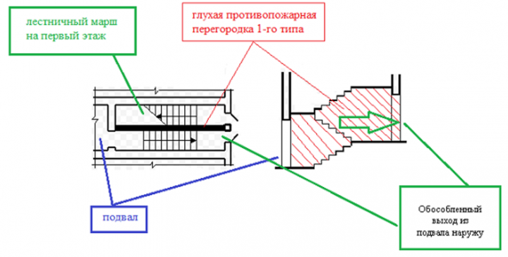 В лестничных клетках, предназначенных для эвакуации людей как из надземных этажей, так и из подвального или цокольного этажа, следует предусматривать обособленные выходы наружу из подвального или цокольного этажа, отделенные на высоту одного этажа глухой противопожарной перегородкой 1-го типа (п.5.2.7 , п.5.3.6 , п.6.1.6 , п.7.1.6 , п.8.1.6 СП 1.13130.2009 "Системы противопожарной защиты. Эвакуационные пути и выходы" (в редакции от 09.12.2010)).