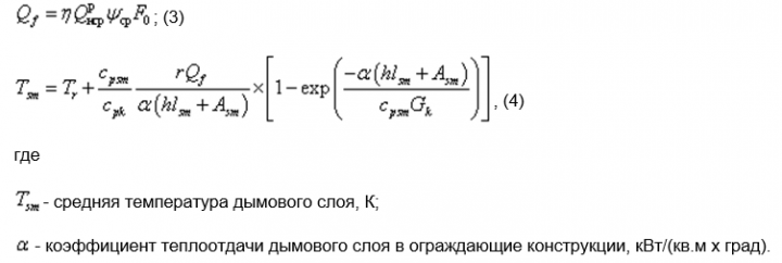 При расчете средней температуры дымового слоя по формуле 4 используется коэффициент теплоотдачи дымового слоя в ограждающие конструкции (б), который зависит от средней температуры дымового слоя.