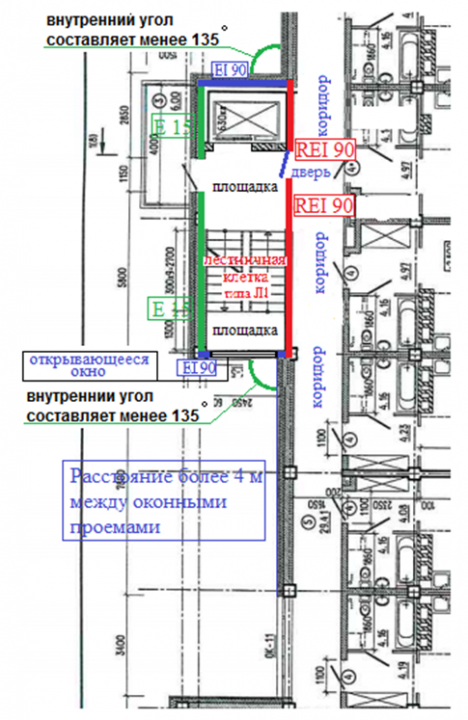 В соответствии с пунктом 2 части 14 статьи 89 Федерального закона от 22 июля 2008 года N 123-ФЗ "Технический регламент о требованиях пожарной безопасности" эвакуационные пути не должны включать участки, ведущие через лестничные клетки, если площадка лестничной клетки является частью коридора. Прошу разъяснить, в каких случаях площадка лестничной клетки может считаться частью коридора? Является ли частью коридора площадка лестничной клетки на плане этажа многоквартирного жилого дома, представленного во вложении?