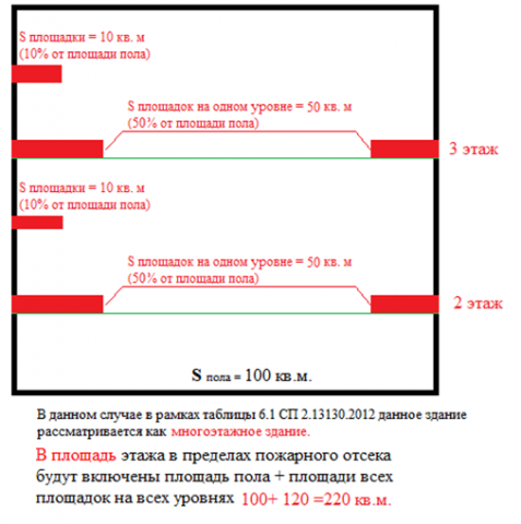 Если брать 40% от площади помещения на определенной отметке, где они расположены (таких отметок в здании шесть) - здание считается шестиэтажное, в соответствии с п.6.1.1 СП 2.13130.2012 , где говорится, что "При определении этажности здания учитываются площадки, ярусы этажерок и антресолей, площадь которых на любой отметке превышает 40% площади этажа здания. При наличии площадок, этажерок и антресолей, площадь которых на любой отметке превышает 40% площади пола помещения, допустимая площадь этажа в пределах пожарного отсека определяется по таблице 6.1, как для многоэтажного здания с числом этажей, определенным с учетом площадок, ярусов, этажерок и антресолей, площадь которых на любой отметке составляет более 40% площади этажа здания."